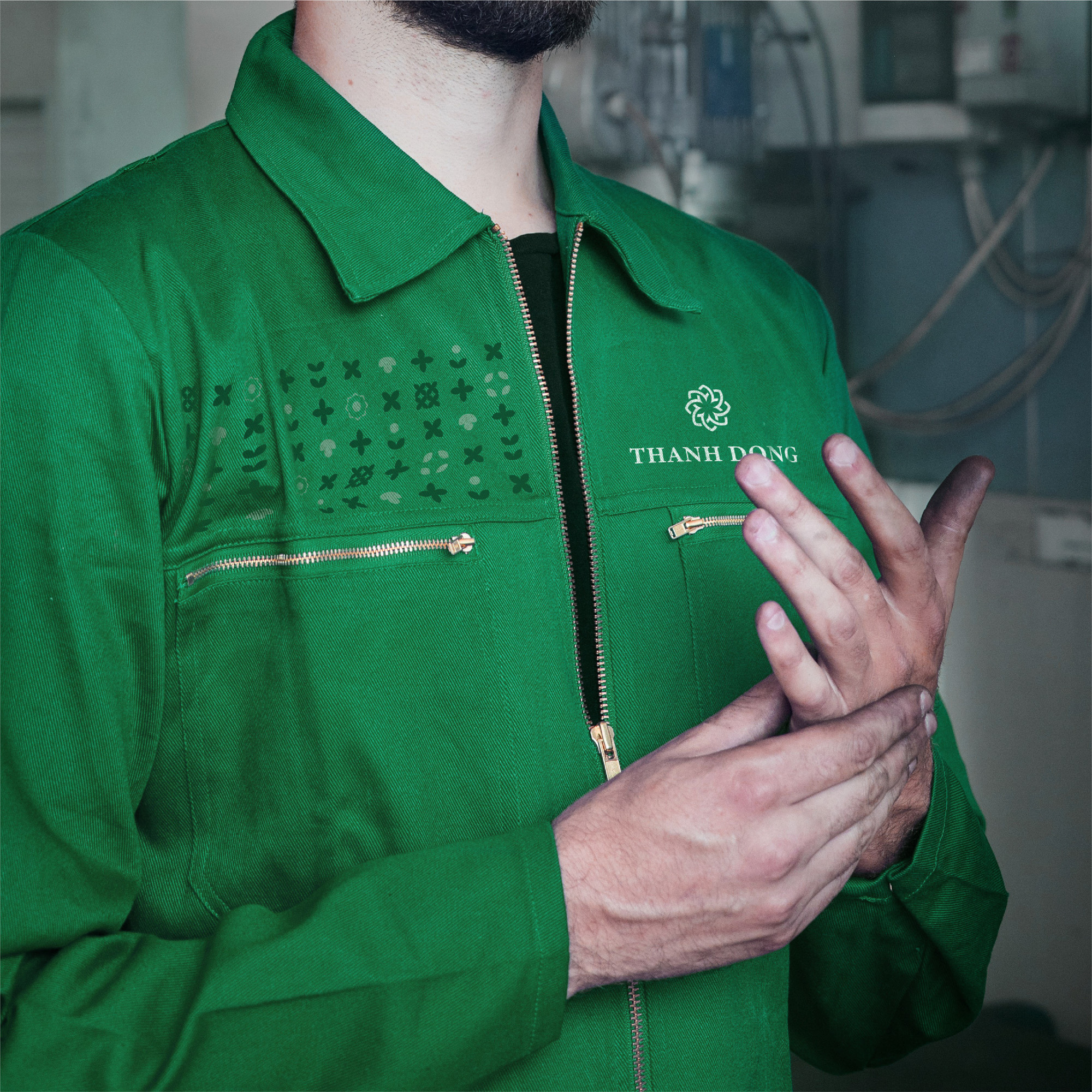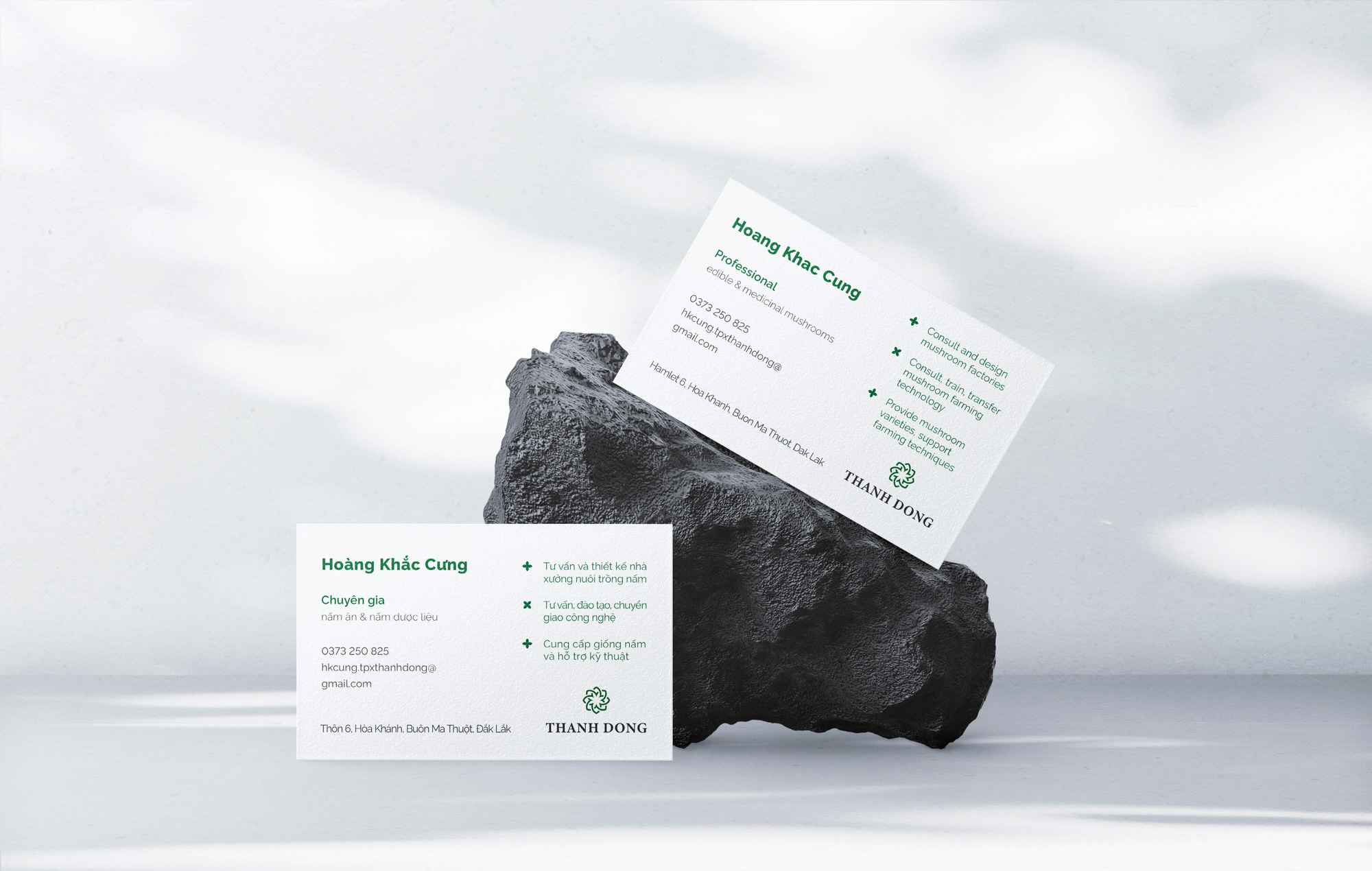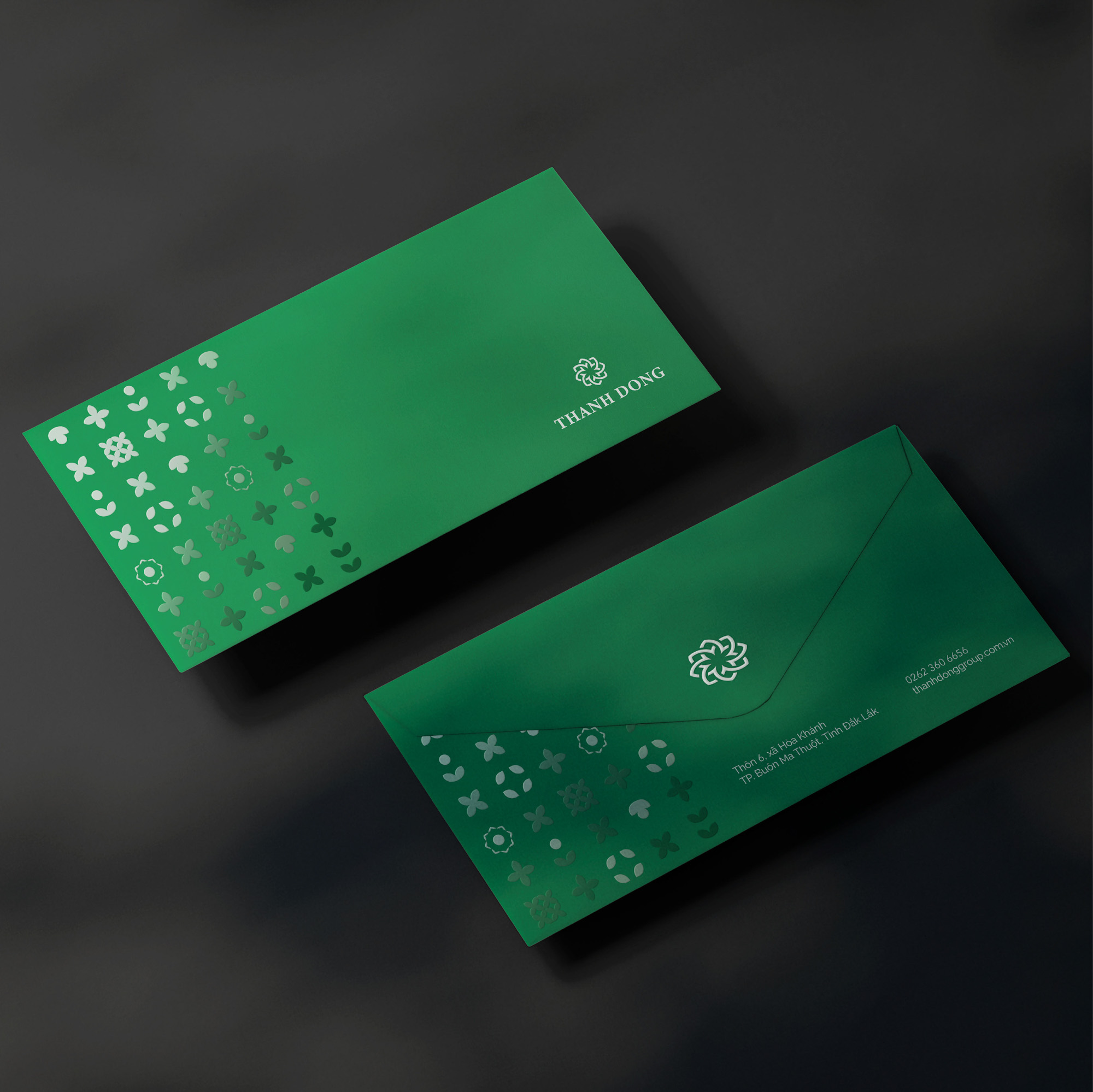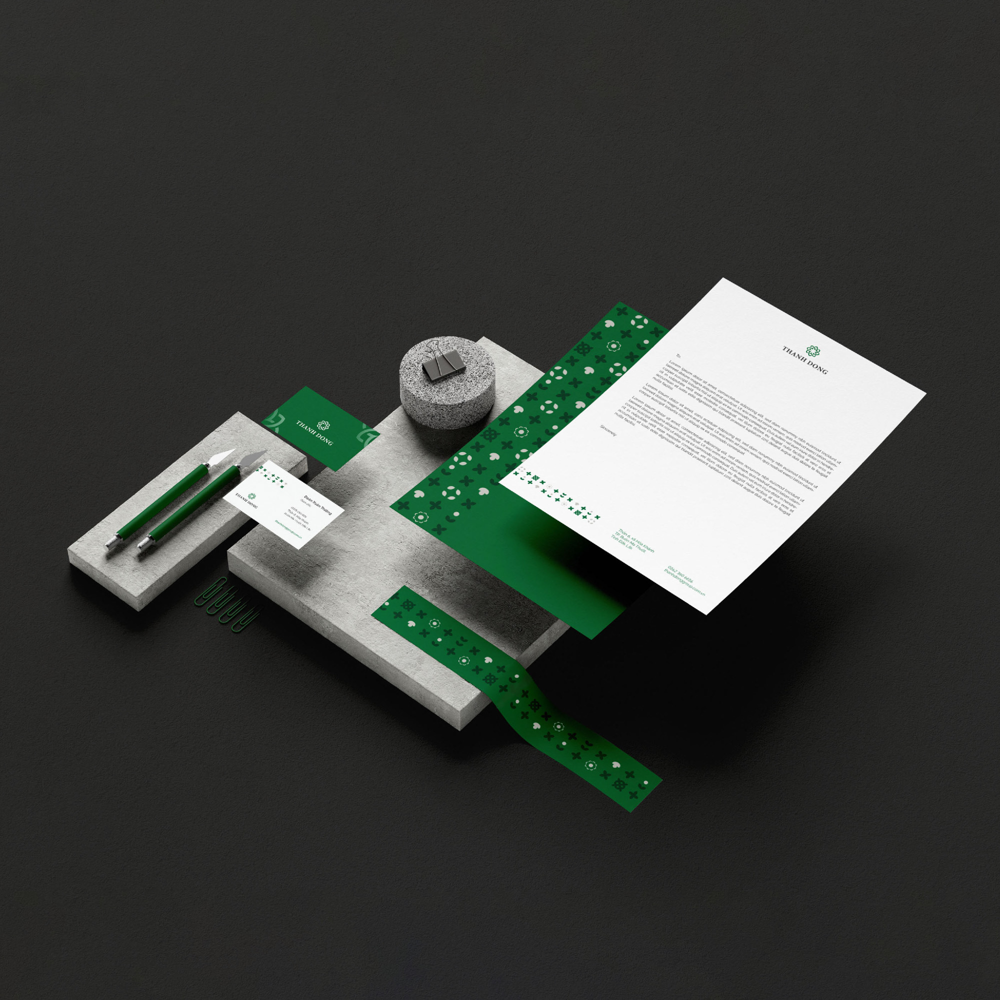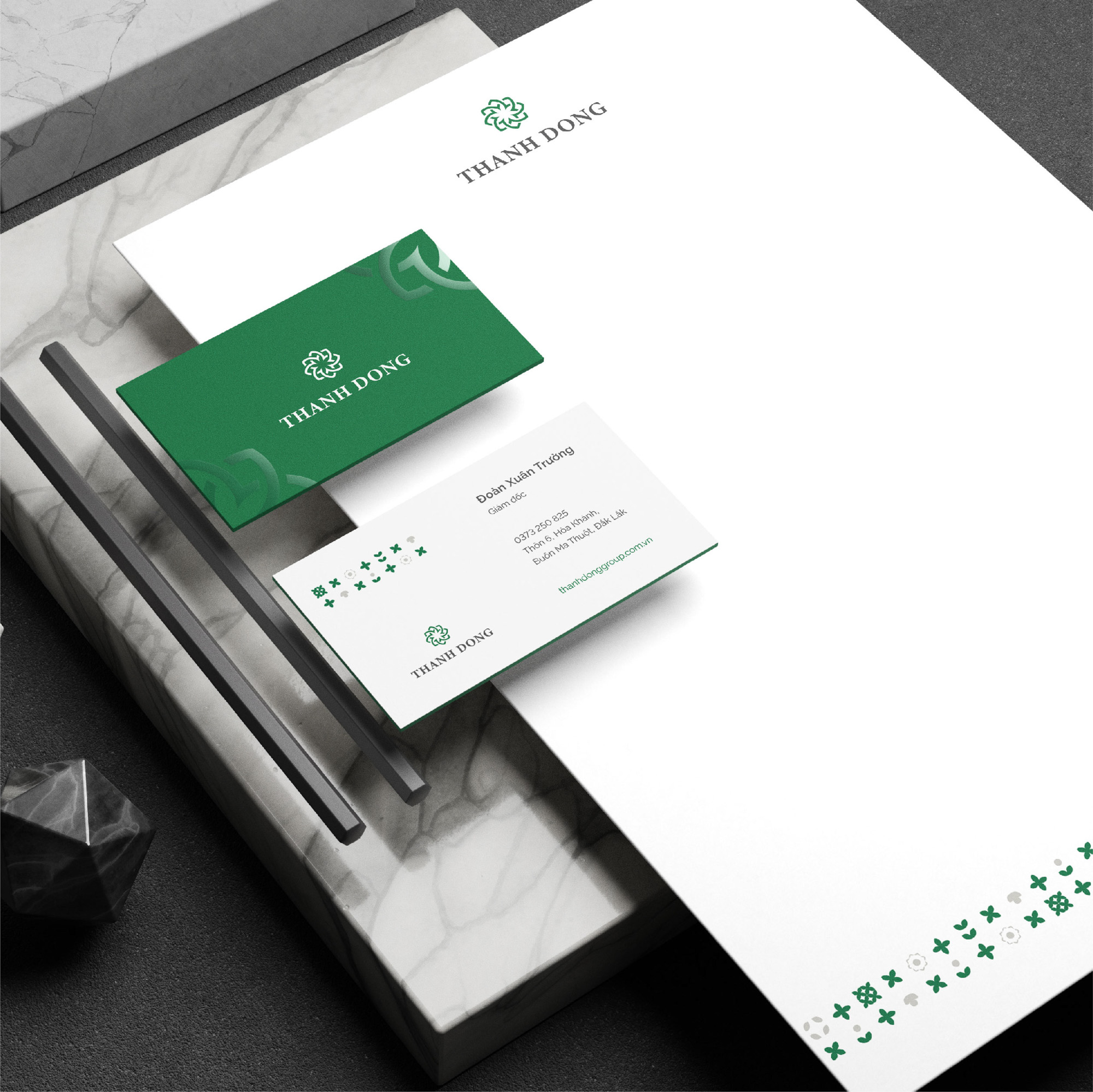 Họa tiết phụ trợ của thiết kế bộ nhận thương hiệu Thành Đồng là sự kết hợp của các đường nét từ logo với năm ngành nghề chủ lực của Thành Đồng gồm Bất động sản, Xây dựng, Điện mặt trời, Trang trại nấm, Nuôi Yến và Trồng dược liệu.